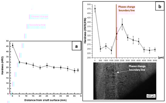 The microhardness test was performed along a track of indentations at intervals of 500 µm in the hardened surface layer of the shaft, to assess the behavior near the phase boundary line, as shown in Figure 12b. The results of the graph show a sudden drop in the hardness at the 1500 µm position regarding the microstructure of polygonal and Windmanstätten banded ferrite before the phase boundary line. These results were consistent with the microstructures analyzed in the previous topic and indicated that the transition phase had a low resistance.