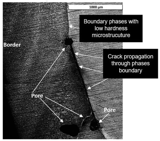 Therefore, according to Figure 12b, it is evident that during the service conditions of the shaft, there was a deformation mismatch between the high hardness microstructure at its surface (0 µm—Figure 12b) and the soft phases just beneath it. Similarly, it is also possible to state that there was a non-homogeneous deformation in the phase contour line (approximately at 2000 µm, Figure 12b), which separated the regions of the material with low hardness (left of the red line) and with high hardness (right of the red line). In view of the great difference in the hardness of the microstructures, there was a high possibility of crack growth occurring at their interfaces, due to the mechanism of decohesion of the structures [,,,]. In the present study, interface decohesion may have been caused by the more pronounced local deformation of the soft constituent, as reported in the literature [,].