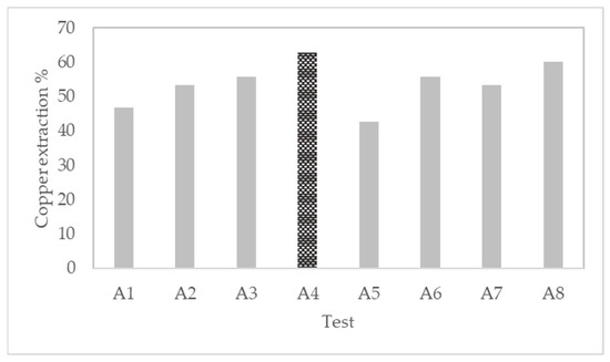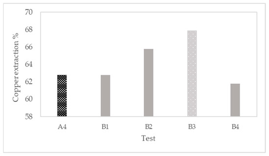 From the first set of tests A, it can be noticed that the best extraction was found in test A4. This test included 25 kg/t ore of H2SO4, 50 kg/t ore of NaCl, and 30 days of curing, obtaining 62.8% of copper extraction. The lowest extraction of 42.7% was obtained in tests A5. This test considered only 17 kg/t ore of H2SO4, 20 kg/t ore of NaCl, and 15 days of pretreatment; see Figure 2.