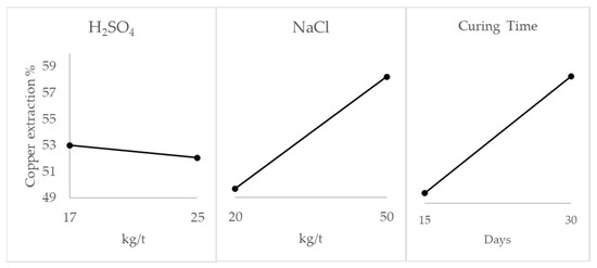 Figure 3 shows the main effect of the variables to evaluate the impact of the reagents and curing time on the extraction. The main effect plot represents the mean extraction at each level of the analyzed variables (i.e., sulfuric acid, sodium chloride, and curing time). The addition of sodium chloride and curing days significantly impacted the pretreatment, increasing the copper extraction by 17% approximately in both cases. On the other hand, the acid dose had a minimal effect, improving the extraction by only 3%.