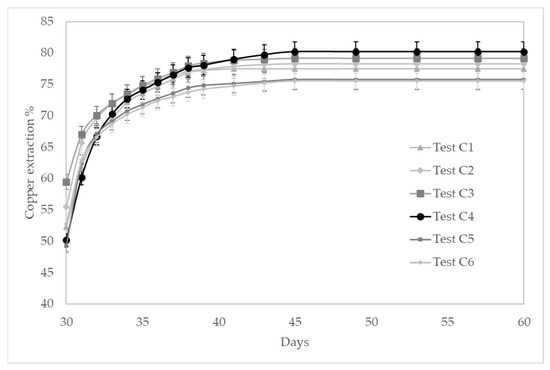 Figure 5 shows the extractions obtained for all columns. After 30 days of pretreatment at optimal conditions defined previously, the maximum is obtained in column C4. The copper extraction was 80.2%, and the asymptote was reached after 15 days of leaching. On the other hand, the lowest extraction was obtained in column C6. The pretreatment stage in these columns considered acid and chloride salt but no iron salts. In the leaching stage, the reagents added were the same as in column C4 except for the ferrous salt in column C6. This condition reduced the extraction to 75.5% approximately.