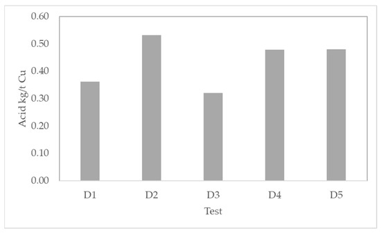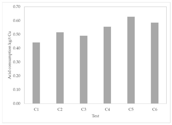 Figure 6 shows the acid consumption per unit of extracted copper of each column. Test C5 had the highest acid consumption with a high rate of 0.63 kg/t Cu, which is equivalent to 48 kg/t ore.