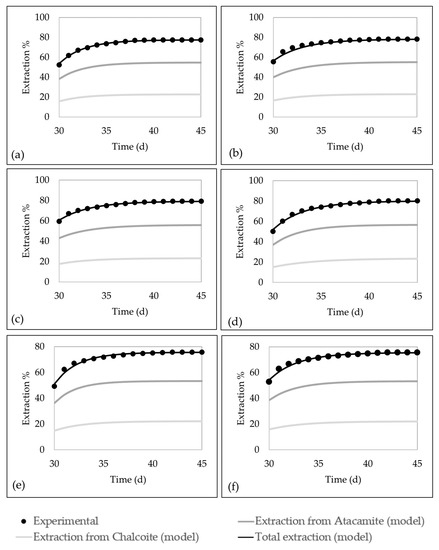 The total copper extraction is contributed by the extraction of every copper mineral species. Equation (11) includes the extraction of all mineral species leached, according to the data from Table 8.