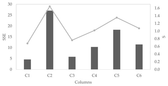 The goodness of fit for each column (test C) modeled, represented in sum of the squared residuals (SSE) (gray columns) and standard deviation of the distance between the data values and the fitted values (S indexes) (light gray line).
