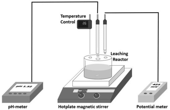The pretreated and untreated chalcopyrite samples were leached in 200 mL (Figure 2) vessels using 100 mL of leaching solution containing 0.2 M of H2SO4 (19.6 g/L) and 50 g/L of Cl ions. The vessels were agitated using a hot plate magnetic stirrer IKA C-MAG HS7 at 200 min−1. When the solution reached desired temperatures of 25, 50, 70, and 90 °C (±1 °C), the 2 g sample of cured or noncured ore was added to the solution, and leaching was carried for a period of 48 h. During the leaching process, the holes in the vessel lid were not covered. Evaporation loss was compensated by adding deionised water.
