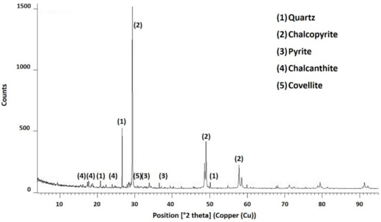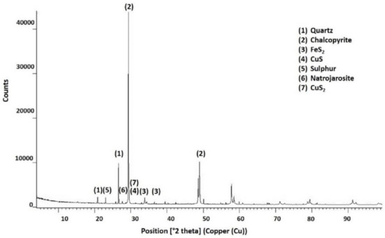 Figure 3 (X-ray diffractogram) shows that the sample was mainly composed of chalcopyrite, together with quartz, pyrite, and chalcanthite. Sulphur can be associated with chalcopyrite and other species, such as chalcocite, covellite, and pyrite. Table 2 shows the mineralogical composition obtained via Qemscan analysis. The main species were chalcopyrite (73.7%), followed by quartz (16.3%) and covellite (1.80%). According to the Qemscan analysis, quartz was present at 16.3%, which is consistent with the insoluble residue product of the chemical characterisation (21.0%).