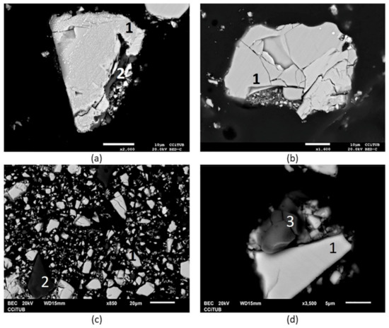 SEM image of the initial sample at various magnifications (a) ×2.000, (b) ×1.600, (c) ×850 and (d) ×3500. 1: chalcopyrite, 2: quartz, and 3: copper sulphate (chalcanthite) [36].