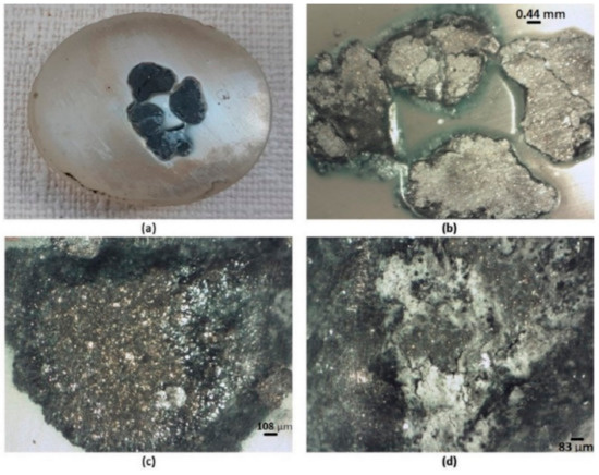 Images of the agglomerates obtained with a stereographic microscope. In (a) initial briquette, (b) at a magnification of ×0.75 and (c,d) at ×5.