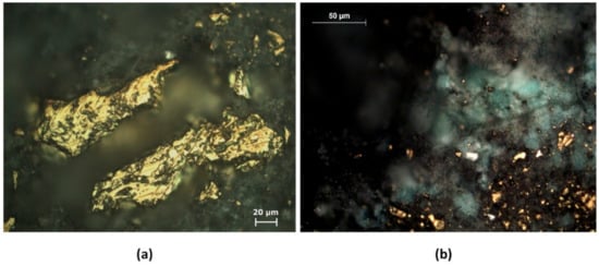 Qemscan analysis was performed using a Model Zeiss EVO 50 (Zeiss, Oberkochen, Germany), with Bruker AXS XFlash 4010 detectors (Bruker, Billerica, MA, USA) and Software iDiscover 5.3.2.501 (FEI Company, Brisbane, Australia). Additionally, a reflected light microscope (Zeiss, Axiovert 100, Milan, Italy) was used. A Stereographic Zoom Microscope (Motic, SMZ-168, Richmond, British Columbia, Canada) was used for a superficial visual analysis. The microscope had a halogen fibre optic illuminator light box (Motic, MLC-150C, Xiamen, China). Finally, morphological characterisation was performed using a scanning electron microscope (SEM, JEOL J-7100F, Tokyo, Japan), operated at 20 kV under high vacuum conditions (Emitech K-950X, Lohmar, Germany) coupled with an energy-dispersive X-ray spectroscopy (EDS) microanalysis system (Oxford Instruments INCA, Oxfordshire, UK). Mineral samples were coated with a thin layer of carbon to improve their conductivity. A carbon source, in the form of a rod, was mounted in a vacuum system between two high-current electrical terminals. When the carbon source was heated to its evaporation temperature, a fine stream of carbon was deposited onto specimens, before SEM characterisation.