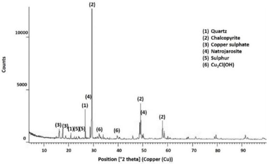 Quartz, chalcopyrite, and natrojarosite are the most abundant species in the pretreatment product. Other products, such as CuSO4, Cu2ClOH, and S0, were also identified. The presence of iron sulphate was reported as probable [18] (according to Reaction (4)). Likewise, the presence of elemental sulphur was proposed by [18,31]. These authors proposed the formation of a CuCl or CuCl2 complex, which differs from what was identified in this investigation.