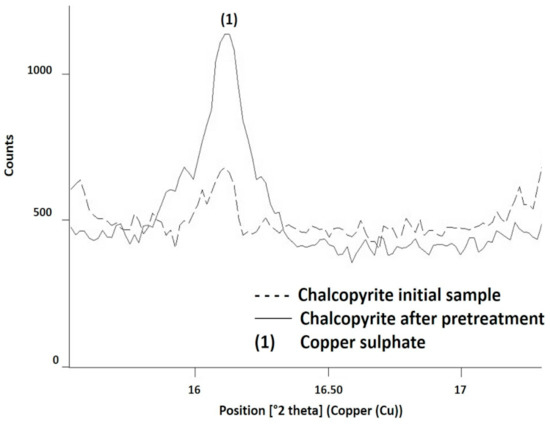 The presence of CuSO4, NaFe3(SO4)2(OH)6, S0, and Cu2Cl(OH) was confirmed by comparing the X-ray diffractogram of the original chalcopyrite with the diffractogram of the pretreatment products. With the software X’pert HighScore Plus v.3.0e, the main angles of the peak characteristics of the different species were identified. The angle (in 2 theta) of 16.16° was characteristic of CuSO4. Although CuSO4 was present in the initial sample as chalcanthite, the peak at 16.16° denotes a greater presence of this species (or, at least, a similar species in the structure) (Figure 8). A copper extraction of 22.66% was obtained with the use of 15 kg/t of H2SO4, 25 kg/t of NaCl, and 15 days of curing at room temperature. Considering that 9% of the copper extraction was associated with chalcanthite, more than 10% of the copper dissolved as a result of generating a new soluble species.