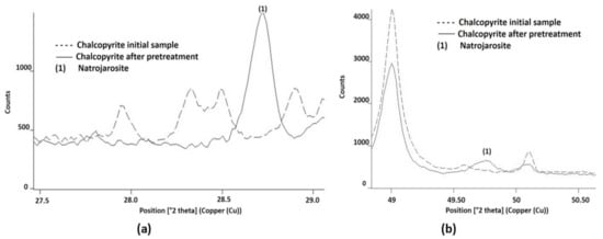 NaFe3(SO4)2(OH)6 identified by X-ray diffraction, a product of the pretreatment of chalcopyrite mineral with 15 kg/t of H2SO4, 25 kg/t of NaCl, and 15 days of curing at room temperature. In (a,b) the new presence of NaFe3(SO4)2(OH)6 was identified as (1), compared with the initial diffractogram of the sample.