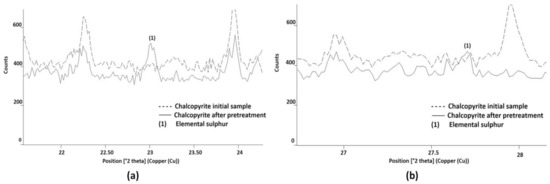 Elemental sulphur identified by X-ray diffraction, a product of the pretreatment of chalcopyrite mineral with 15 kg/t of H2SO4, 25 kg/t of NaCl, and 15 days of curing at room temperature. In (a,b) the new presence of elemental sulphur was identified as (1), compared with the initial diffractogram of the sample.