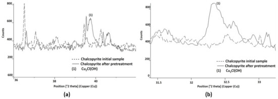 Cu2Cl(OH) identified by X-ray diffraction, a product of the pretreatment of chalcopyrite mineral with 15 kg/t of H2SO4, 25 kg/t of NaCl, and 15 days of curing at room temperature. In (a,b) the new presence of Cu2Cl(OH) was identified as (1), compared with the initial diffractogram of the sample.
