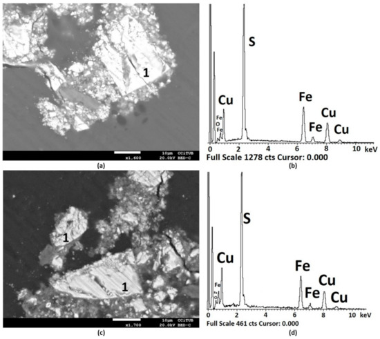 Figure 18 shows an SEM image of the leaching residue at 70 °C with pretreatment. Unreacted chalcopyrite particles (1) were observed appearing as leaching products on the surface. Figure 19 shows a sequence of SEM images and mapping analysis for four chalcopyrite particles remaining in the residue from leaching at 70 °C with pretreatment (Figure 18). The elements analysed were Cu, Fe, and S. Figure 19b,d show the presence, respectively, of Cu and S around the chalcopyrite particles.
