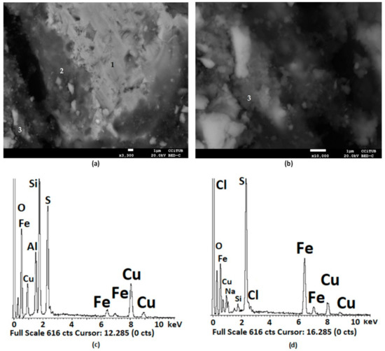 SEM images (a,b) and EDS analysis of chalcopyrite (1) and reaction products, such as CuSO4 (2) (EDS in (c)) and NaFe3(SO4)2(OH)6 (3) (EDS in (d)), products of the pretreatment of chalcopyrite mineral with 15 kg/t of H2SO4, 25 kg/t of NaCl, and 15 days of curing time at room temperature. In (a) at a magnification of ×3.300 and (b) at ×10.000.