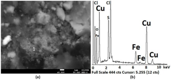 SEM image (a) and EDS analysis (b) of zone 1. The EDS confirms the formation of Cu2Cl(OH) (1) in the products of the pretreatment of chalcopyrite mineral with 15 kg/t of H2SO4, 25 kg/t NaCl, and 15 days of curing at room temperature. In (a) at a magnification of ×5.500.