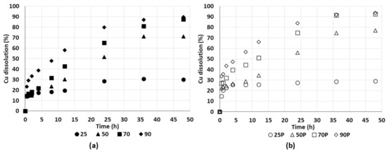 The dissolution of copper from chalcopyrite without pretreatment (a) in 0.2 M of H2SO4 and 50 g/L of Cl− ions from NaCl in deionised water at 25 °C (●25), 50 °C (▲50), 70 °C (■70), and 90 °C (♦90) and with pretreatment (b) at 25 °C (○25P), 50 °C (△50P), 70 °C (□70P), and 90 °C (◊90P).