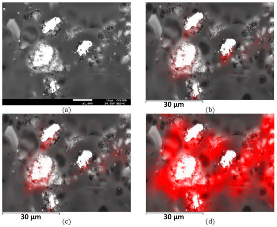 SEM mapping analysis of the leaching residue performed at 70 °C with pretreatment. (a) Chalcopyrite particles (1). Elements of interest are shown in red: (b) Cu, (c) Fe, and (d) S [46].