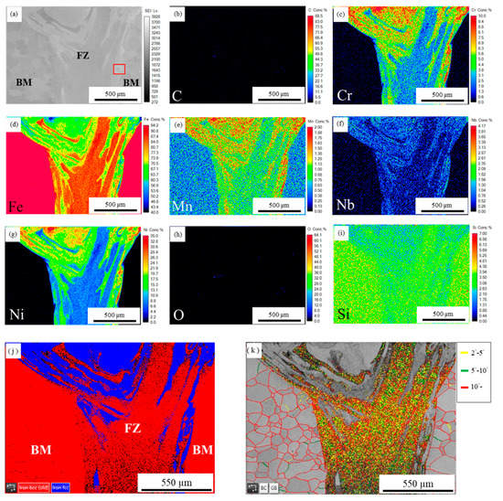 Figure 2b–i illustrate WDS quantitative element mappings of C, Cr, Fe, Mn, Nb, Ni, O and Si in at%. In comparison between the EBSD crystallographic map (Figure 2j) and quantitative element mapping results (Figure 2b–i), the BCC structure is rich in Fe and Si (Figure 2d,i). In contrast, the austenite is alloyed with Cr, Mn, Nb and Ni (Figure 2c,e–g). There are almost no carbon contamination and oxidation of the weldment as demonstrated in Figure 2b,h.