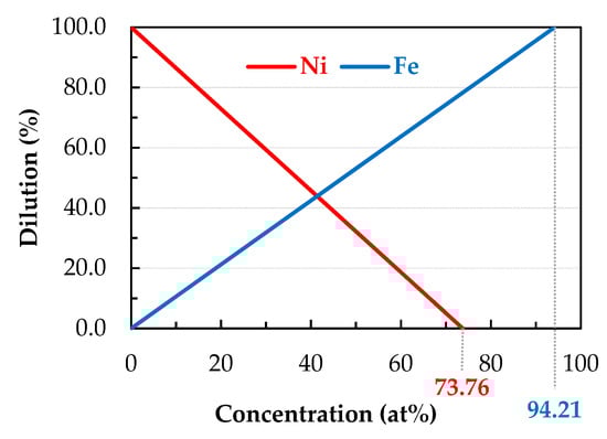 The dilution of FZ calculated based on Fe and Ni concentrations in quantitative WDS mappings of Figure 2d,g.