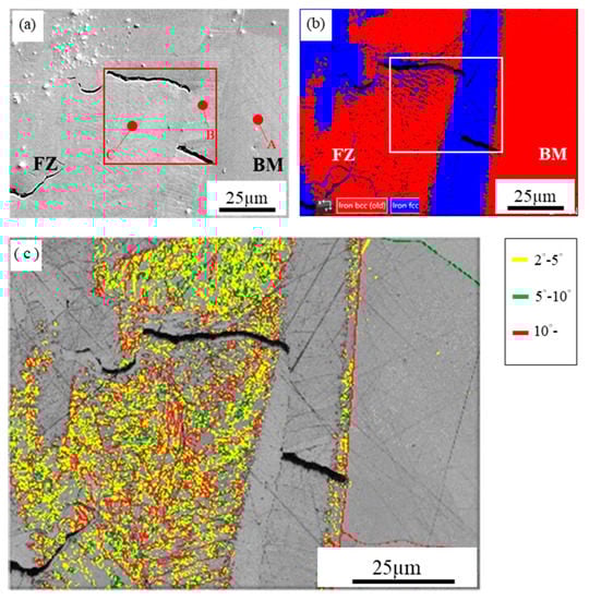 Figure 4a shows the EPMA SEI of the selected area in Figure 2a at higher magnification. There are a few hot cracks in the FZ next to the BM. Figure 4b displays the EBSD crystallographic map of Figure 4a. In Figure 4b, the red BCC phase on the right side of the figure is BM ferrite. The FZ consists of austenite (blue) and BCC structure (red). There are huge blocky and banded austenites and BCC structure at a macroscopic scale due to incomplete mixing in laser welding. Additionally, interdendritic austenite is widely observed next to the BCC structure at a microscopic scale. The formation of interdendritic austenite results from the final stage of solidification in the FZ. Figure 4c shows EBSD boundary misorientation at the identical location of Figure 4b. According to Figure 4b,c, hot cracks were initiated/propagated along interdendritic austenite as well as in the banded austenite free of boundaries. Boundaries, especially for high-angle ones, in the BCC structure prevent hot crack propagation in the FZ, as illustrated in Figure 4c.
