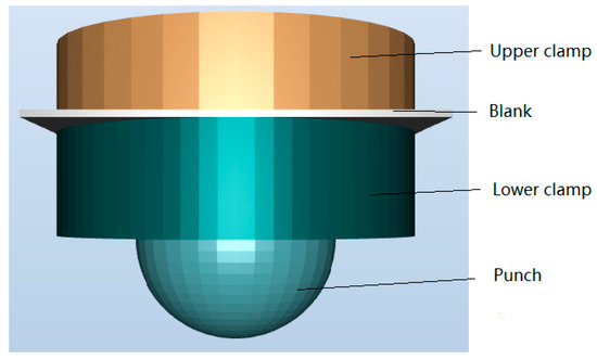 The commercial FEA software package ForgeNxT was utilized to model the limiting dome height deformation process. Figure 1 shows the FE simulation set-up for the LDH tooling. The model consists of 4 parts: punch, blank, upper clamp, and lower clamp.