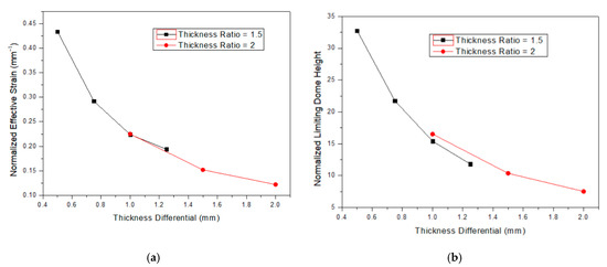 (a) Relationship between the thickness differential and normalized equivalent plastic strain; (b) relationship between the thickness differential and limiting dome height.