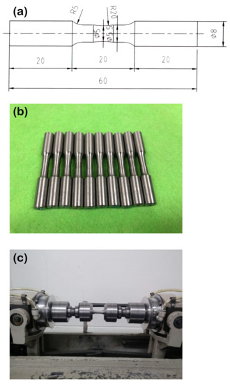 Illustration diagram and photos for dynamic rotation bending fatigue test; (a) schematic diagram of fatigue specimen, (b) machined fatigue specimens, and (c) dynamic rotation bending fatigue test system.