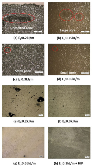 Optical micrograph images of the EBM AM-printed Ti6Al4V specimens before and after chemical etching; (a) EL:0.2 kJ/m-before chemical etching, (b) EL:0.25 kJ/m-before chemical etching, (c) EL:0.3 kJ/m-before chemical etching, (d) EL:0.35 kJ/m-before chemical etching, (e) EL:0.2 kJ/m-after chemical etching, (f) 0.3 kJ/m-after chemical etching, (g) 0.65 kJ/m-after chemical etching, and (h) 0.3 kJ/m + HIP process-after chemical etching.