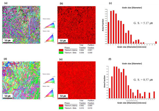 The EBSD data of the specimen before and after HIP treatment can be confirmed through Figure 3. Figure 3a–c showed the inverse pole figure EBSD map, phase map, and measured grain size distribution of the EL:0.3 kJ/m condition among non-HIP specimens. Figure 3d–f are those of the EL:0.3 kJ/m condition after HIP treatment. In Figure 3b, 0.009 fraction of beta phase was measured, and the total fraction of the alpha phase and the beta phase was 0.892. Accordingly, the pore fraction at the corresponding position was measured to be 0.108. In Figure 3c, there were almost no grains with over 15 μm size, and the average grain size of EL:0.3 kJ/m was measured to be 5.17 μm. It can be seen that the fraction of the phase and pores after HIP treatment was significantly lowered when compared to that before HIP treatment, in Figure 3e. The total fraction of the alpha phase and beta phase was 0.992, and the measured pore fraction was 0.008. Through this, it was possible to confirm the reduction of porosity through HIP treatment. In Figure 3f, the average grain size was measured to be 8.57 μm, which is due to the grain growth by high treatment temperature in the HIP conditions (920 °C, 100 MPa). It was confirmed that after HIP, the number of grains with over 15 μm size increased when compared to the specimen before HIP treatment, and the fraction of beta phase did not differ significantly between before and after HIP treatment.