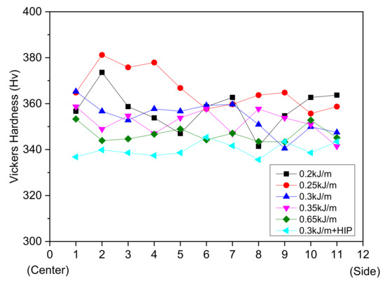 The average Vickers hardness values of the specimens with a scan speed of 800 mm/s and fabricated with the process conditions of 0.2–0.35 kJ/m were measured as 357 Hv for the condition of 0.2 kJ/m, 365.5 Hv for the condition of 0.25 kJ/m, 354.6 Hv for the condition of 0.3 kJ/m, and 352.4Hv for the condition of 0.35 kJ/m, and there was a tendency to slightly decrease in hardness according to increases in the line energy (Figure 4). If the amount of heat input for the same scan speed is highly determined, the cooling time will be relatively longer, which will affect the grain size. That is, as the amount of heat input increased, the grains were coarsened and that showed a decrease in hardness values. On the other hand, if the heat input supplied by the line energy is not sufficient (as the condition of 0.2 kJ/m), the internal unmelted zone may be widely distributed due to the insufficient melting and solidification of the fabricated powder, and the defects just below the surface may be present (as Figure 2a), which may contribute to the large decrease in hardness. This can be found in the description of the properties of the microstructure in Figure 2a. For the specimen of 0.65 kJ/m, it showed large increases in the heat input per hour due to the low scan speed. Thus, it represented a very small average hardness value, 346.3Hv, because of the greater coarsening in crystal grains. In addition, the HIP processed specimen was the specimen performing the pressurized heat treatment at 920 °C and the average hardness value of 340 Hv was measured. It represents a decrease in hardness due to the coarsening in crystal grains caused by the same mechanism as the preceding specimens.