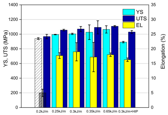 In the conditions of EL = 0.25–0.35 kJ/m, a tendency to increase tensile strength and yield strength according to increases in the line energy was shown. This represents an inverse proportional result to the tendency of the Vickers hardness, and it can be explained by the strain hardening effect mechanism. As the line energy increases, the residual heat remaining in the previous layer causes an annealing effect and that causes strain hardening during a plastic deformation process under tensile loading [26]. Thus, the more the line energy, the higher the yield strength and tensile strength. In addition, as the strain hardening effect increases, the effect of hardness values on yield strength decreases. Typical materials show a proportional relationship between hardness and yield and tensile strength, but those with a high strain hardening effect or very low hardness and yield strength do not have a proportional relationship [27]. In contrast to the results of the microstructural analysis described in Section 3.1, the results of the room temperature tensile test may not be proportional to the effect of increase of line energy and grain coarsening. In addition, it is deemed that pores less than 100 μm do not significantly affect the results of the room temperature tensile test.