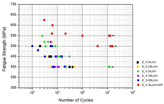 Figure 6 shows the results of the high cycle dynamic rotation bending test at a stress level more than 400 MPa. The specimen of EL: 0.3 kJ/m achieved the number of rotations more than 107 without being destroyed under the stress of 400 MPa. This value is less than one-half of the room temperature tensile value and can be verified to be excellent compared with Ni-based superalloy 625 (tensile strength: 930 MPa, fatigue strength: 380 MPa) [24]. The specimen of EL: 0.65 kJ/m was destroyed at a stress of 450 MPa with the number of rotations recorded as 2 × 105, and that was a similar value compared to the specimen of 0.3 kJ/m under the same stress. The additional tests for the specimen of 0.2k J/m were stopped due to several internal defects observed in the fracture section. The specimen of 0.25 kJ/m showed fatigue failures at the number of rotations less than 105 in different loads under 400 MPa. Except for the conditions of the scan speed of 800 mm/s and line energy of 0.3 kJ/m, the other conditions did not achieve the number of rotations, 107, that did not result in failure under a load of 400 MPa or more, and the results of these dynamic fatigue failure were found to be different from the results of the quasi-static tensile test. The fatigue strength of the specimen processed by the condition of 0.3 kJ/m + HIP was measured as 550 MPa that shows an increase of 150 MPa for the specimen of 0.3 kJ/m recorded as 400 MPa. This shows that the fatigue strength improvement through the HIP treatment is excellent at 37.5% when compared with the increase in the fatigue strength by 5% [28] as the increase in the fatigue strength through a post heat treatment is 20 MPa. Therefore, the HIP processing process is more effective than the post heat treatment process [28] in order to significantly improve the high cycle fatigue properties of AM-printed products fabricated by the EBM method.