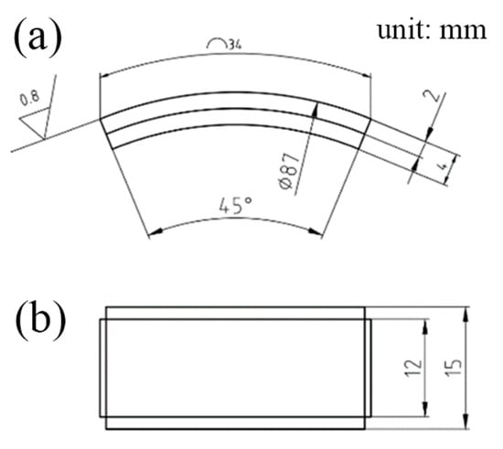 A dynamic high temperature autoclave (FCZ5-20, DL Kemao Test Equipment Co., Ltd., Dalian, China) was used for rotary coupon test in this work. Considering the circular motion of testing samples in the autoclave, arc-shaped specimens were machined from L245N standard steel. If the sample surface was flat, the velocity of the fluid flowing through the sample surface would be nonuniform, and that would affect the corrosion test. Figure 1 shows the dimensions of the specimen. The outside curved surface with a width of 12 mm was the experimental surface, and other surfaces covered with silica gel were non-experimental areas without contact with the experiment solution. The corrosion scales formed on the specimens after 1/2 day, 2, 4 and 7 days corrosion test in the autoclave was measured by scanning electron microscopy (SEM; JEOL Ltd., Tokyo, Japan), energy dispersive spectroscopy (EDS) and XRD (M21X, MACSCIENCECO, Ltd., Tokyo, Japan), respectively. Finally, the corrosion products were removed to obtain the corrosion rates, and the surface morphologies after descaling were characterized by a white light interferometer (Bruker Surface Profiler, Contour GT-K1, Bruker Nano, Inc., Tucson, AZ, USA).