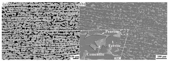 Figure 2a shows the OM image of L245N standard steel. It can be seen that the microstructure consists of coarsely banded ferrite/pearlite in a banded arrangement. These bands are organized in a thickness of one or more grains, parallel to the axis of the tube, and perpendicular to the radius of the tube. Figure 2b shows the SEM image of metallographic structure where the laminar cementite in pearlite can be found. The region with black dotted bands shows the pearlite phase, the white lamellar structure in the pearlite is the cementite phase, and the outside black region is the ferrite phase. Based on the statistics, the pearlite content in L245N standard steel is approximately 24.4%, the average grain size is approximate 16.72 μm, and the thickness of banded pearlite is about 8.5~24.3 μm.
