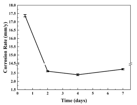 Figure 3 shows the corrosion rate of L245N standard steel in simulated solution after different times. The mean corrosion rates after 1/2, 2, 4 and 7 days of the test is 17.37, 2.61, 2.40, and 2.74 mm/y, respectively. A maximum value of the corrosion rate is observed after 1/2 day of the test. The corrosion rate is significantly reduced after 2 days of the corrosion test. Then, it shows a trend of slightly decreasing followed by increasing with corrosion time. According to the NACE RP-0775-2005 standard [36], the corrosion behavior of L245N standard steel in high salinity is associated with serious corrosion.