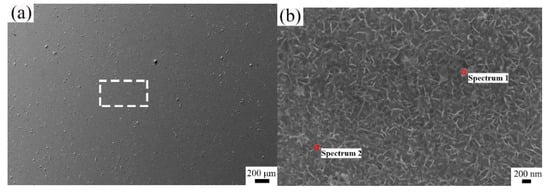 Figure 4a shows the SEM image of the corrosion scale of L245N standard steel, and Figure 4b is the enlarged image of the selected area marked in Figure 4a after 1/2 day of testing. No obvious corrosion groove can be found on the surface. There are some granular and flocculent corrosion products formed. Table 3 is the EDS result of corrosion scale formed on L245N standard steel after 1/2 day of the corrosion test. The corrosion products mainly consist of the elements of Fe, C and O. The stoichiometric ratio of O in the products is much lower than that of O in the iron oxide, which means that only a very thin corrosion scale forms on the surface after the 1/2 day test.