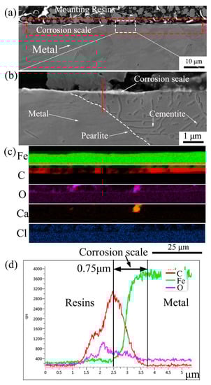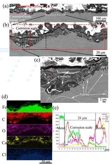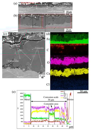 Figure 11a shows SEM image of a cross-section of L245N standard steel after 7 days of testing. Figure 11b is the enlarged SEM image of the area of the white box marked in Figure 11a. The corrosion scale with the thickness of 10~42.4 μm forms on the surface. Figure 11c is the enlarged SEM image of the area in the black box marked in Figure 11b. The white phase with lamellar structure in the corrosion scale can be considered as the remaining cementite from the dissolution of pearlite [37,38]. The corrosion scale is not clearly delaminated; nearly two layers of remaining cementite can be found in it. The amount of remaining cementite in the corrosion scale is 8.0 ± 0.3 μm2 per unit length (μm) of corrosion scale. Obvious cracks and holes among the remaining cementite can be observed, indicating that the corrosion scale containing remaining cementite has a large internal stress, leading to the formation of some defects. Furthermore, some large cracks breakthrough the corrosion scale and localized corrosion under them can be observed. Meanwhile, the boundary between the matrix and the corrosion scale is uneven, and obvious remaining banded cementite structure can be seen at the boundary, indicating that localized corrosion is associated with banded pearlite. Figure 11d is the EDS mapping of the area in red box marked in Figure 11b. The corrosion scale consists of the elements of Fe, C, O and Ca; the area with remaining cementite is rich in Fe and poor in Ca. A small amount of Cl also can be found in the corrosion scale. Figure 11e is the EDS compositional profile along the red line marked in Figure 11b. Compared to the content of Ca after 4 days of corrosion testing, the higher content of Ca in the corrosion scale after 7 days of corrosion testing indicates that more corrosion products of Ca deposit, forming a thick clay-like corrosion scale.