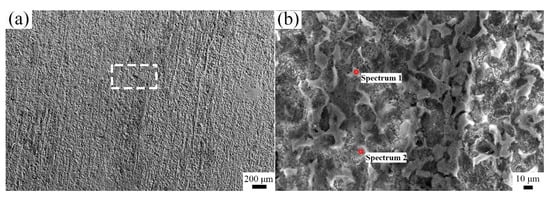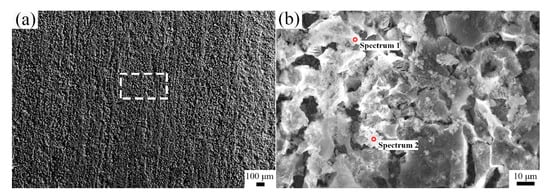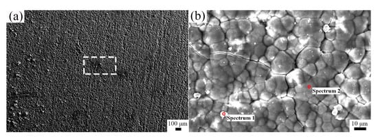 (a) SEM image of the corrosion scale of L245N standard steel and (b) the enlarged image of the selected area marked in (a) after 2 days of testing.