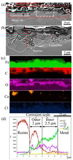 Figure 7a shows the SEM image of a cross-section of L245N standard steel after 2 days of testing. It can be seen that the corrosion scale with the thickness of 0.55~5.45 μm forms. Further, the preferential dissolution can be found at the position of thick scale. Figure 7b is the enlarged SEM image of the area in the white box marked in Figure 7a. The corrosion scale consists of two layers. The inner film mainly consists of remaining laminar cementite. Its orientation is consistent with that in pearlite in matrix. The amount of remaining cementite in the corrosion scale was obtained by using the Image-Pro Plus software (Version 6.0, Media Cybernetics, Silver Spring, MD, USA ), and the value is 2.6 ± 0.3 μm2 per unit length (μm) of corrosion scale. The outer film does not contain the laminar cementite. The preferential dissolution occurs for the ferrite within the pearlite. Figure 7c is the EDS mapping of the area in the red box marked in Figure 7a. A thick corrosion layer enriched in O can be found, and Cl in the corrosion scale is poor. Figure 7d shows the EDS compositional profile along the red line marked in Figure 7b. The corrosion scale consists of the elements of Fe, C and O. Its outer and inner film possess the thickness of 2 and 2.5 μm, respectively. The inner layer contains more content of Fe than that in outer layer due to the presence of the remaining cementite.