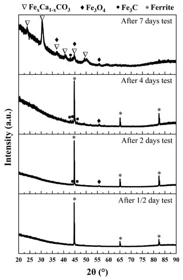 Figure 12 shows the XRD patterns of L245N standard steel after different times. From the XRD patterns, the corrosion products after 1/2 day of testing are not detected. Only a small amount of Fe3O4 and remaining Fe3C can be found after 2 days of testing; similar peaks of Fe3C can be found in the literature [31]. Corrosion products after 4 days of testing are still Fe3O4 and Fe3C, but their contents are much greater than were present after 2 days of testing, which is consistent with their SEM and EDS results. After 7 days of testing, a large number of corrosion products consisting of FexCa1−xCO3 were found, and a small amount of Fe3O4 and Fe3C can also be detected. However, phases containing Cl cannot be detected due to their low content.