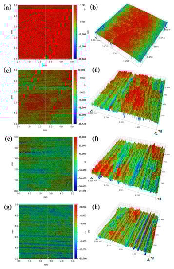 Figure 13 is the image of surface morphology after removing corrosion products after different times. It can be found that the surface morphology of the sample was roughly divided into sharp and deep linear grooves, shallow and wide band grooves, pits etc. The grooves are parallel to the flow direction of rotation in the autoclave. Figure 13a,b shows the plan and stereogram images of the surface morphology after 1/2 day of testing. No obvious grooves are found, instead some micro-pits are present. Figure 13b,c shows the plan and stereogram images of the surface morphology after 2 days of testing. There are 8 linear shallow grooves, and parts of the surface show micro-pits, which indicates that some locations of L245N standard steel appears to have obvious priority corrosion. Figure 13e,f shows the plan and stereogram images of the surface morphology after 4 days of testing. There are 17 linear grooves uniformly distributed over the entire surface, showing the characteristics of uniform corrosion. They indicate that the corrosion after 4 days of testing is more extensive than that after 2 days of testing. Figure 13g,h shows the plan and stereogram images of the surface morphology after 7 days of testing—there are 20 linear grooves uniformly distributed over the entire surface. Obviously, compared to that after 4 days of testing, the number of linear grooves does not increase much, but they are deeper and wider. In addition, the Ra of surface morphology after different times was 0.335 μm, 2.769 μm, 5.414 μm and 7.945 μm, respectively. The increasing tendence of Ra with time is consistent with the change of surface morphology.