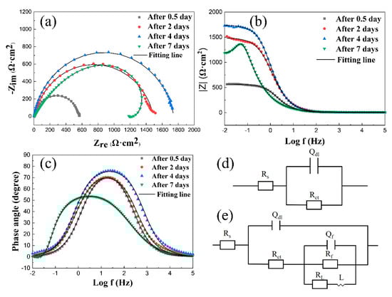 EIS plots of L245N standard steel after different times: (a) Nyquist diagram; (b) Bode impedance vs. frequency diagram; (c) Bode phase angle vs. frequency diagram, and electrochemical equivalent circuits for EIS fitting after different times: (d) 0.5–4 days; and (e) 7 days.