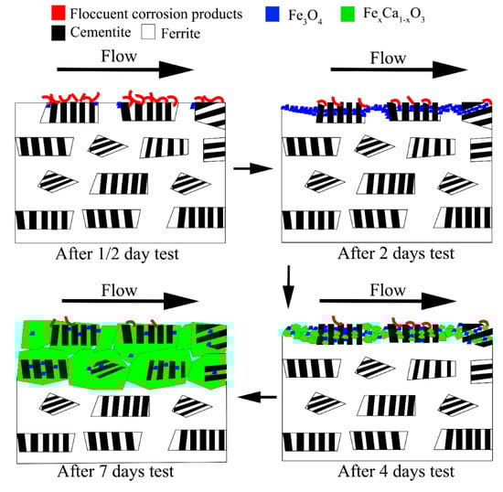 Under the effect of the flow solution, the deposition characteristics of the corrosion scale after different times were clearly different. Figure 16 shows the corrosion process with time under flow condition. Some flocculent corrosion products deposited on the surface after 1/2 day of testing, which had limited inhibition of ion diffusion. However, after 2 days of testing, some banded pearlite was corroded to leave lamellar cementite, where Fe3O4 deposited on their surface to form the corrosion scale. Obviously, it was more difficult for ions to pass through the cementite layer and oxide layer, resulting in the decline of the corrosion rate. After 4 days of testing, a layer of banded pearlite was corroded completely. Some corrosion products consisted of FexCa1−xCO3 and Fe3O4 deposited among the remaing lamellar cementite layer, forming the thicker corrosion scale. Obviously, the thicker corrosion scale had better inhibition of ion diffusion, causing the corrosion rate to decline further. However, after 7 days of testing, the corrosion rate increased with the formation of a thick clay-like corrosion scale. The reason may be related to the formation of FexCa1−xCO3 compound and the increasing of the remaining cementite. Calcium is bigger than iron; the density and molar volume values of FexCa1-xCO3 formed by calcium which replaced the iron in FeCO3 were different, forming a more porous corrosion scale, which would compromise the protective properties [17]. Thus, the continuously enhanced galvanic corrosion effect of the remaining cementite and localized corrosion caused by the poor protective FexCa1−xCO3 scale led to the corrosion rate increase. Meanwhile, from the results of SEM, the difference in the amount of the remaining cementite formed after 2 and 4 days of testing was not significant, they were 2.6 ± 0.3 and 3.6 ± 0.4 μm2 per unit length (μm) of the corrosion scale. Thus, the thicker scale played a greater effect on the corrosion process to cause the decline of the corrosion rate after 4 days of testing. In addition, there was a correlation between the deposition of FexCa1−xCO3 and the thickness of the remaining cementite. Until a double-layer cementite skeleton formed, a significant amount of FexCa1−xCO3 deposited and stacked, thus there was a critical thickness of the remaining cementite to produced corrosion products.