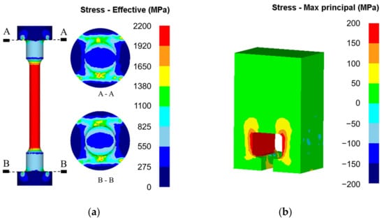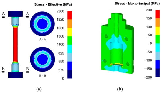 The analysis was carried out under the same conditions with two types of jigs. As a result of the analysis of the previous method, fracture in the gage length section was predicted, and fracture in the neck of the grip section was also predicted, as shown in Figure 5a. It seemed that the stress was concentrated because the contact area between the grip section and the specimen was insufficient. Figure 5b shows the result of the die stress analysis, where the maximum stress was 772 MPa. There was no fracture in the jig, but fatigue fracture may have appeared from repeated use. These results indicate that the probability of fracture decreased due to the dispersion of the stress and the increase in the contact area between the specimen and the jig. The die stress analysis results show a low maximum stress of 167 MPa, as shown in Figure 6b. It was expected that no fractures would appear in the jig. From this result, the proposed jig did not show breakage or fatigue fracture with 0.21 times the stress of the conventional method.