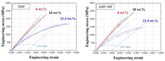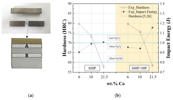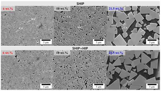The results of the hardness and impact tests had an inverse relationship, as shown in Figure 10. The hardness test results were similar to the tensile test results, and there was a proportional relationship with Young’s modulus. When compared with the hardness value of conventionally prepared WC-Co, it was confirmed that the hardness value was high in the case of 6 wt.% Co and 10 wt.% Co [5,26]. The 21.5 wt.% Co appears to have a low value due to the difference in Co content, but exhibits almost similar hardness values. In the impact test, the higher the Co content, the higher is the impact energy. The energy of the 6 wt.% Co and 21.5 wt.% Co was increased by HIP after SHIP, but that of the 10 wt.% Co was decreased. From these results, it is clear that when the Co content is high, the hardness decreases and the impact energy increases. HIP after SHIP improved the mechanical properties, but there was no significant change.