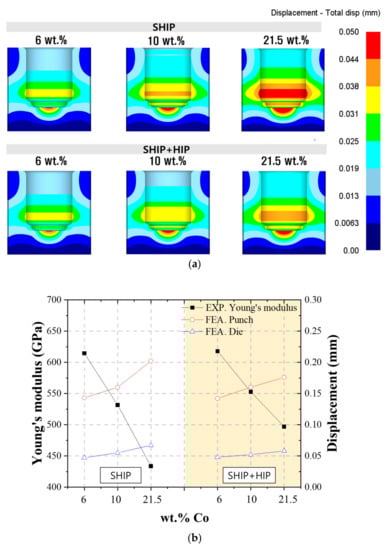 As a result of applying the die stress analysis based on the results obtained from the tensile test, the stress values applied to the die were all the same, so there was a difference in the displacement value of the die according to the stress. The smaller the displacement value, the less the deformation of the die; therefore, this method is considered to be the most suitable for a cold-forging die. Figure 14 shows the results of the die stress analysis and compares Young’s modulus and displacement. As a result of the analysis, the specimen with a lower Co content and HIP exhibited a low deformation. In the case of 6 wt.% Co, the displacement of the punch and die was reduced from 0.143 mm and 0.047 mm to 0.142 mm and 0.048 mm, respectively, by the HIP treatment. The 10 wt.% Co showed little change: the displacement of the punch and die were changed from 0.16 mm and 0.055 mm to 0.16 mm and 0.052 mm, respectively, by the HIP treatment. Both 6 wt.% Co and 10 wt.% Co had no significant change regardless of HIP. In the case of 21.5 wt.% Co, the displacement of the punch and die was reduced from 0.202 mm and 0.067 mm to 0.176 mm and 0.058 mm, respectively, by the HIP treatment. It was confirmed that the displacement increased when Young’s modulus was lowered, and the displacement was decreased by the HIP treatment. It seems that the density and bonding strength increased owing to the HIP treatment. From this result, 6 wt.% Co might be the most suitable material for a cold-forging die, regardless of HIP treatment. The life of the cold die might vary depending on the stress ring and the design method. For improving the quality and expendability, further studies may use other parameters, such as pressure variations, with diffusion bonding during sintering [30].