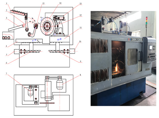 The schematic diagram and realistic image of 3MK136B bearing raceway grinder. 1. Charging trough; 2. swing arm of grinder loads/unloads automatically; 3. discharging trough; 4. the workbench; 5. servo motor for workpiece carriage; 6. ball screw; 7. motor for grinding wheel spindle; 8. motor for work arbor; 9. ball screw; 10. servomotor for dressing carriage; 11. dressing carriage; 12. diamond pen; 13. dresser part; 14. grinding wheel; 15. workpiece.