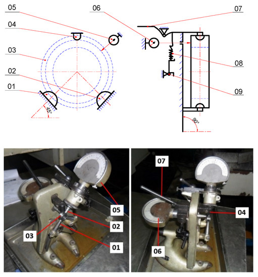 The oval level of the raceway bottom diameter was measured by a D022 measurement equipment (made in China) with an accuracy of 1 μm, as shown in Figure 3. This equipment applies the comparative method to measure the oval of the raceway bottom diameter. Before measuring, it is necessary to select the standard sample bearing. In the measuring process, the first step is to press the lever of the bracket that is used to fix the raceway of bearing (no. 7) to take out the sample bearing. After that, the ball bearing’s inner ring (no. 3) is put in the measurement equipment. Then, the lever (no. 7) is released to let the pin (no. 4) fix the raceway’s position. Next, the raceway surface that needs to be measured will be located on two lock pins (no. 1 and no. 2). In this position, the ball bearing’s inner ring will be circled one round. The measuring meter (no. 5) indicates the maximum and minimum values of the raceway bottom’s diameter. The difference between these maximum and minimum values is its oval value. Meanwhile, the measuring meter (no. 6) indicates the maximum and minimum values of the distance from its raceway’s central line to its head surface. Based on that, the circular run-out of its raceway central line with its head surface is easily determined. Therefore, each measurement can simultaneously determine four tolerances including the raceway bottom diameter’s oval level, the circular run-out of its raceway central line to its head surface, the raceway bottom diameter’s dimension tolerance, and the dimension tolerance of the distance from its raceway central line to its head surface.